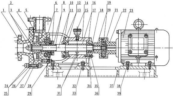 6、如果更換滾珠軸承或泵軸時(shí),必須折下機(jī)架,松開前端軸承蓋4只螺釘,折下泵軸后端園螺母和聯(lián)軸節(jié),將泵軸向前端方向打出即可,再后折下后端軸封蓋。
